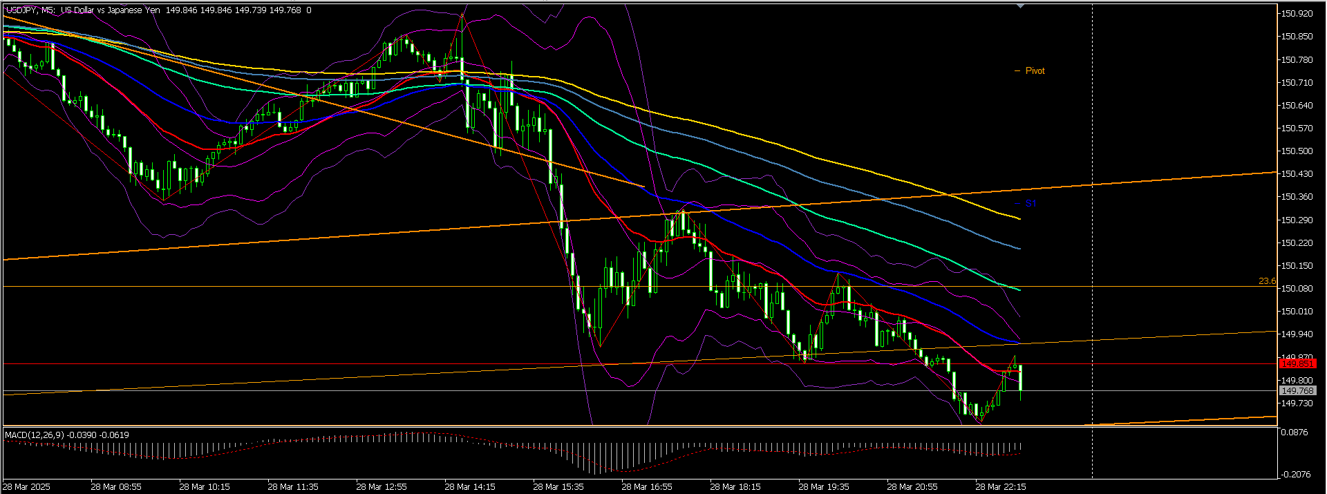 上窓をつけていればショート。ロングエントリーなしでひたすら様子見に徹し、149.500を抜けるようなら5分足の50日線を参考に戻り売りを狙っていきます。