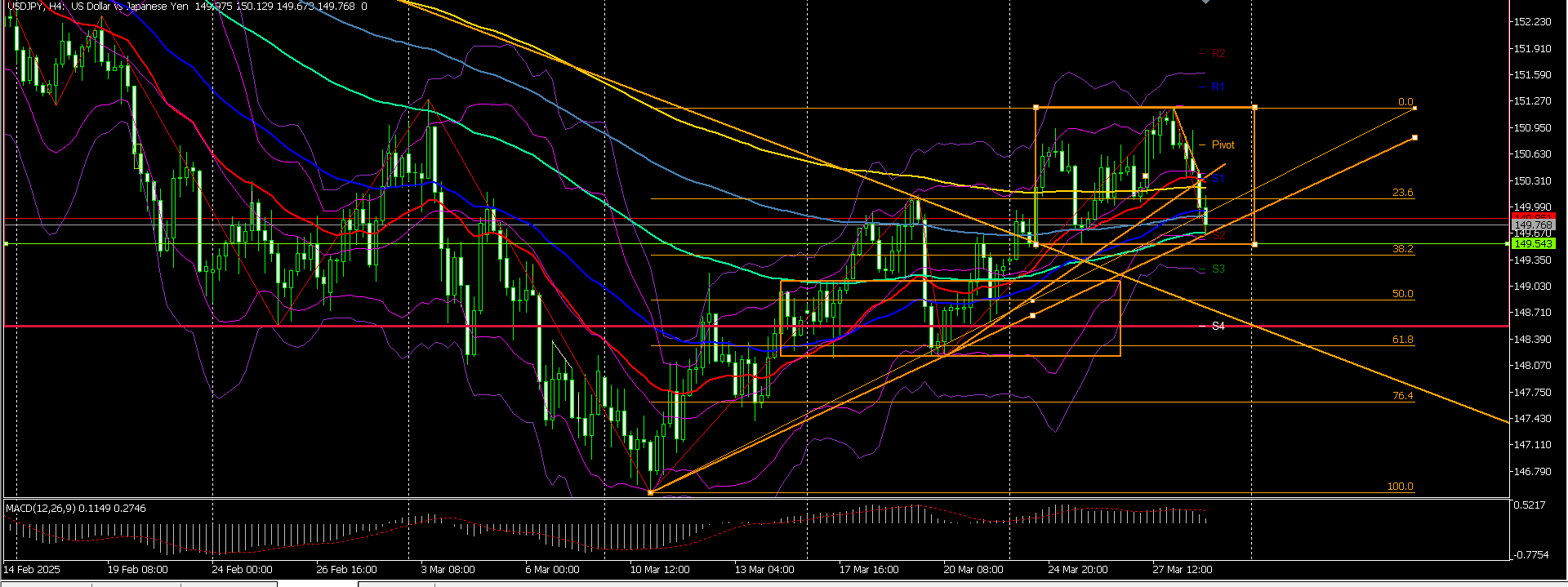 けど2番目の上昇線できっかりサポートされています。ピヴォットS2のおかげかもしれません。直近のサポートは緑線149.500付近。けどオレンジBOXとフィボ38.2が重なっているのでレンジだとすれば上がる可能性もある。