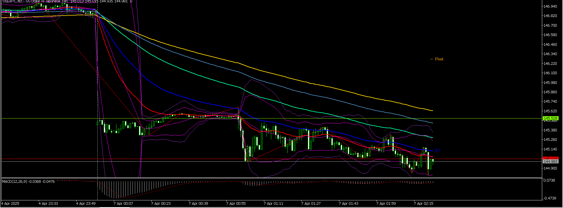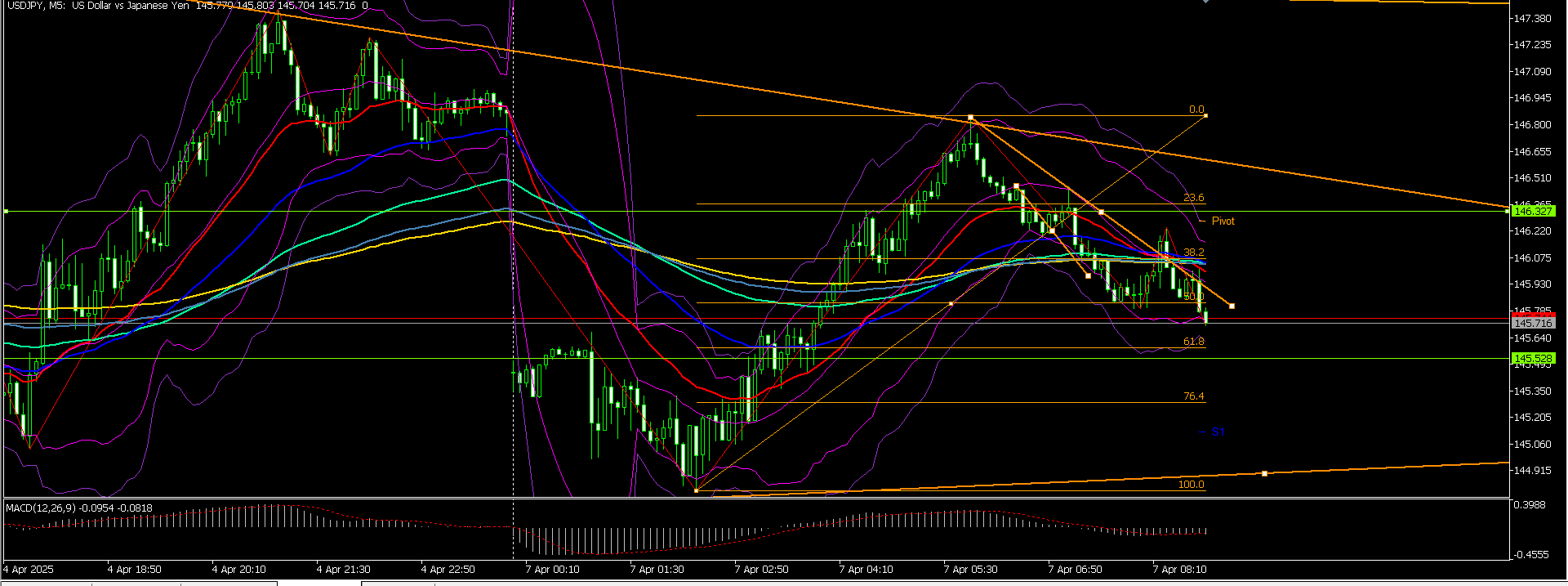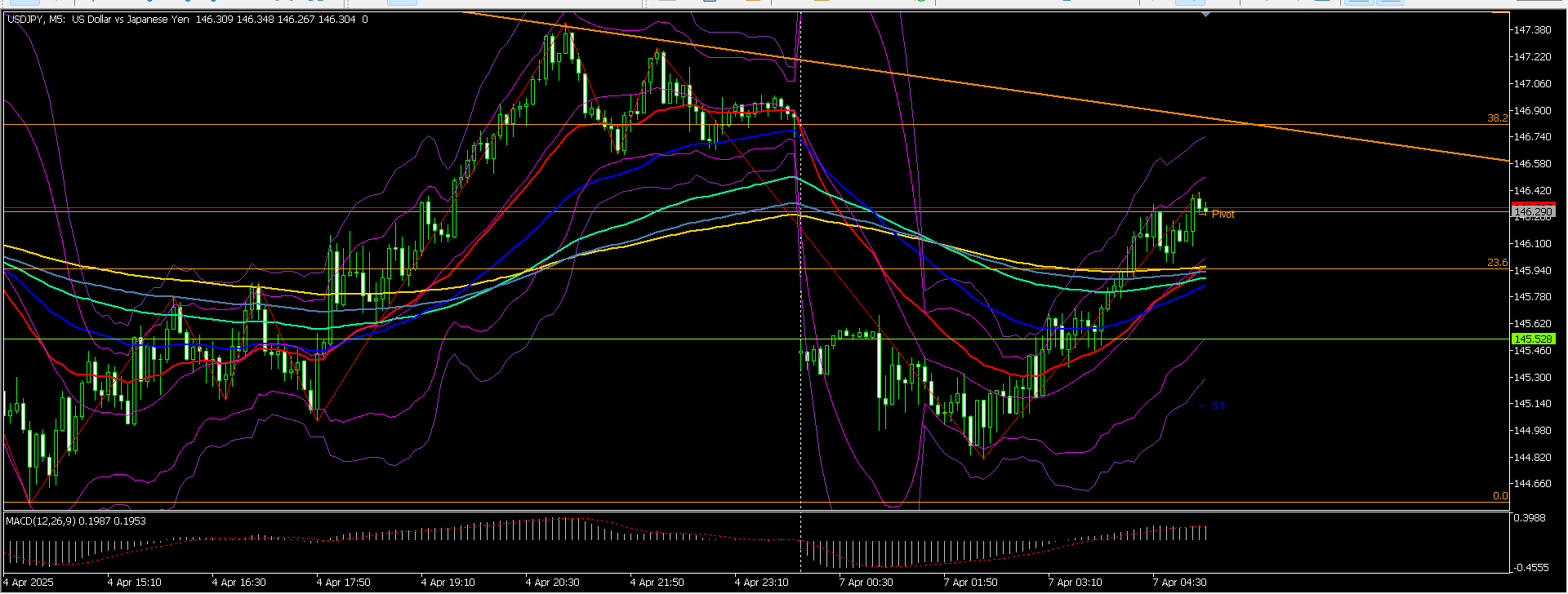 これは1分足。この後レンジを抜けて上にいくんですね~。大体、月曜日の窓ががっぱり開いている。朝1でこれを確認したら窓とは逆の方向にかけるべきなんです。なのに私は小さいレンジの動きに惑わされ往復びんたをくらい、諦めてショートしたとたんにグングン上に伸びるという地獄を味わいました。