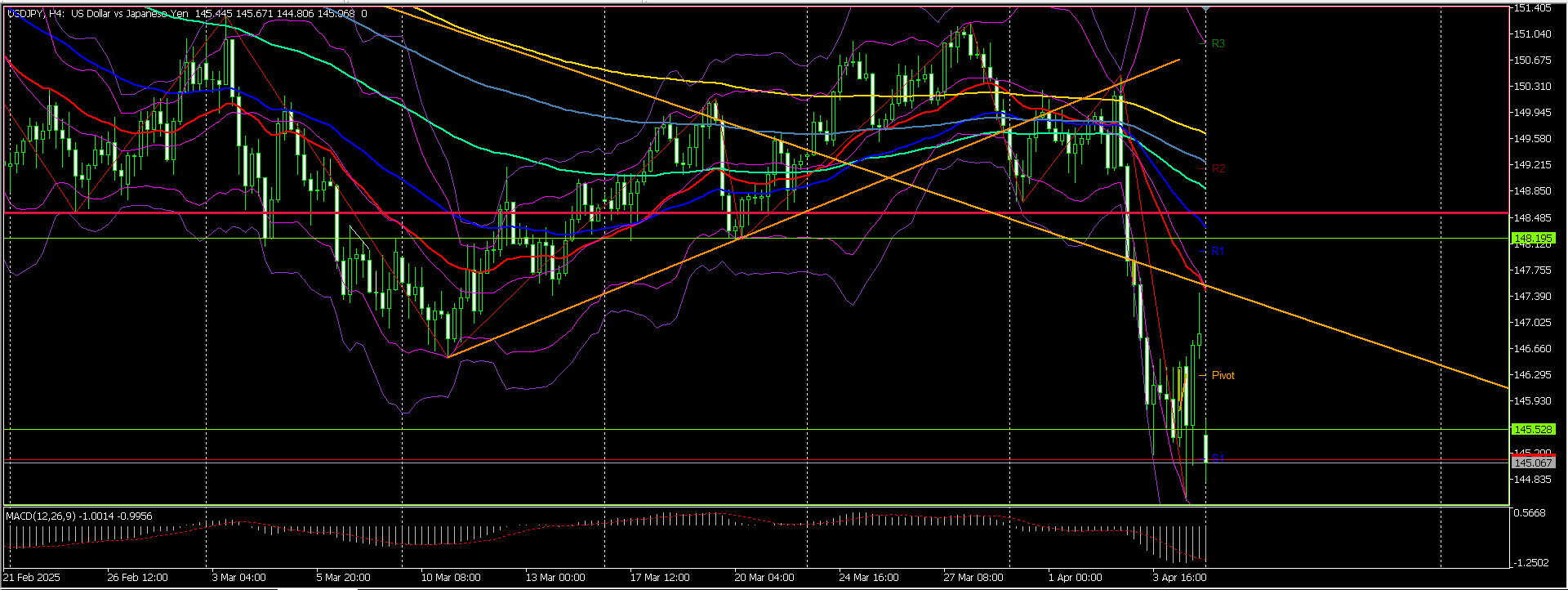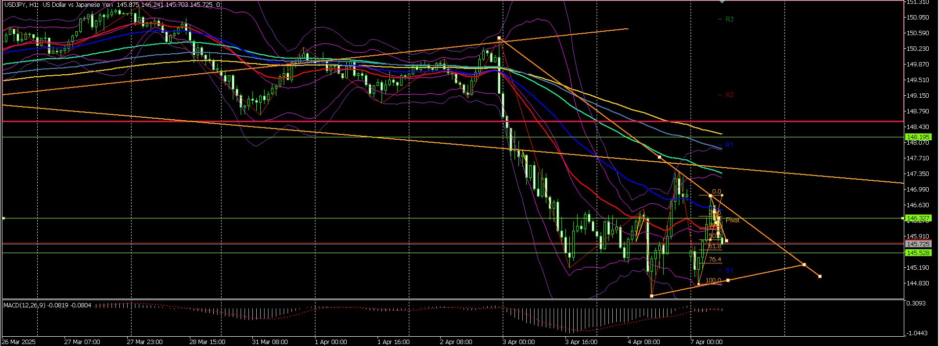 4時間足。ローソクは移動平均線より下、陰線、下落トレンド。これは下がる!と思うでしょう?ところが(´;ω;`)