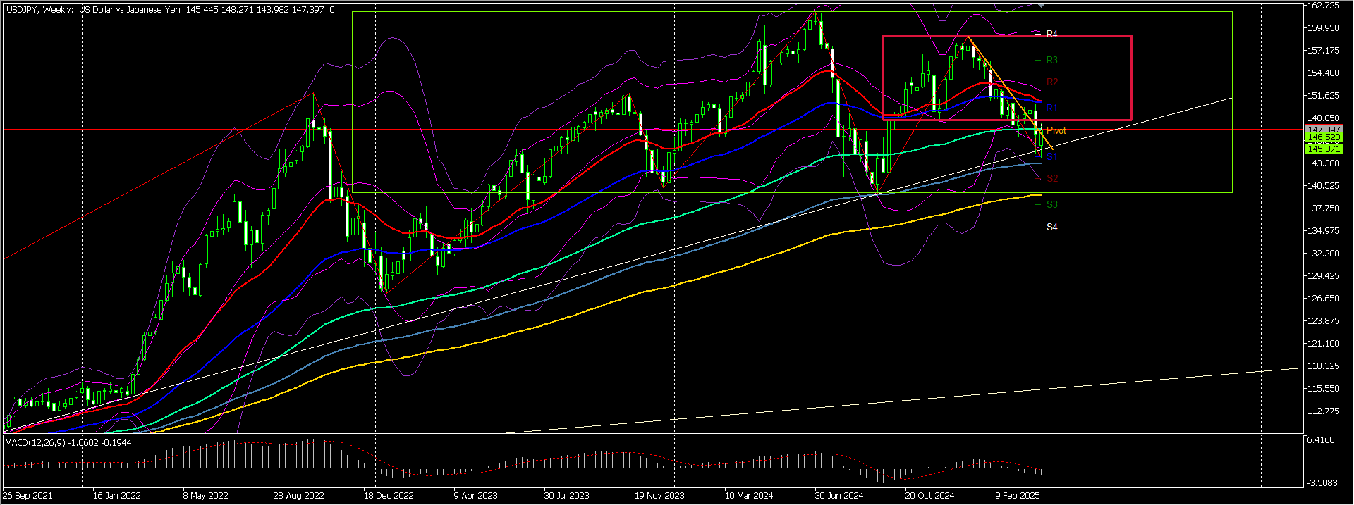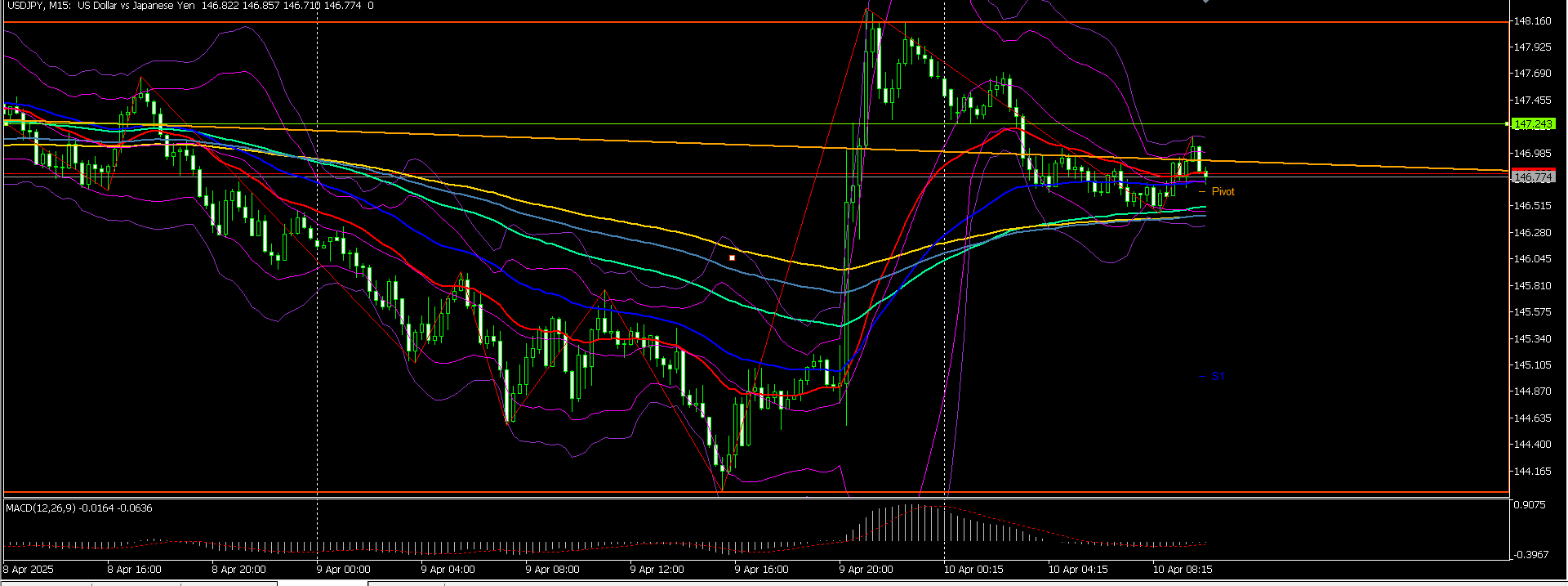 が!!なんとアメリカ様が関税を90日間延長すると深夜(日本時間)に発表してしまったもんだから、一時148.100まで上がっていました。